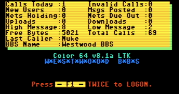 All - Westwood BBS has transitioned over to Color 64 v8.1a with Lt Kernal and is running fresh and clean! @Darkstar was a huge help in getting the ball rolling. Luckily I was suffering a back injury and got a ton of computer time to get the BBS setup.